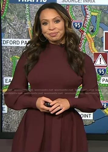 Adelle Caballero on Today on NBC was spotted wearing this brown long sleeve knit dress on Today on Oct 17 2023's episode. Adelle's Dress is the Naydine Dress by Ted Baker.