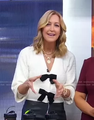Lara Spencer on Good Morning America on ABC was spotted wearing this white bow detail cardigan on Good Morning America on Oct 17 2023's episode. Lara's Sweater is the V-Neck Bow Cardigan by Express.