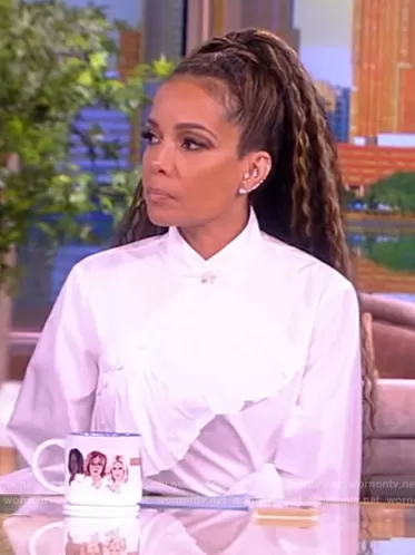 Sunny Hostin on The View on ABC was spotted wearing this white ruffle blouse and pants on The View on Oct 18 2023's episode. Sunny's Top is the Ruffled Poplin Blouse by Gucci . Sunny's Pants is the Luminosity Wide-Leg Tailored Pants by Zimmermann.