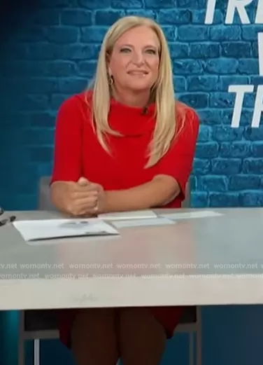 on Access Hollywood on NBC was spotted wearing this red folded neck dress on Access Hollywood on Nov 10 2023's episode. 's Dress is the Roll Neck Sheath Collar Dress w/ V-Back by Adrianna Papell.