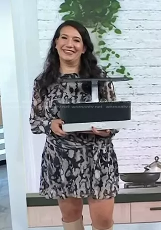 on Today on NBC was spotted wearing this grey abstract print dress on Today on Oct 18 2023's episode. 's Dress is the Tie Waist Long Sleeve Minidress by Topshop.
