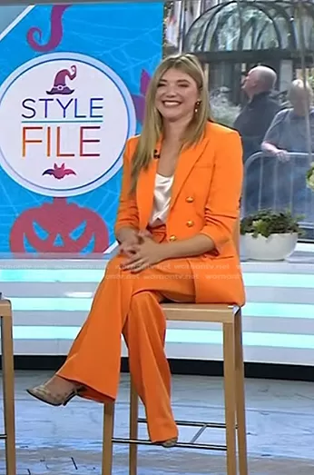 on Today on NBC was spotted wearing this orange pant suit on Today on Oct 18 2023's episode. 's Jacket is the Tomi Dickey Jacket by Veronica Beard . 's Pants is the Robinne Pants by Veronica Beard . 's Sheos is the Aria 76 Monogram Slingback Mules by Gucci.