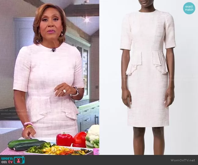 Robin Roberts on Good Morning America on ABC was spotted wearing this pink tweed peplum dress on Good Morning America on Oct 18 2023's episode. Robin's Dress is the Peplum Tweed Sheath Dress by Carolina Herrera.