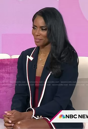 on Today on NBC was spotted wearing this navy blazer with striped trim on Today on Oct 19 2023's episode. 's Jacket is the Chamberlain Trim Blazer in Midnight/Even Stripe by L'Agence.