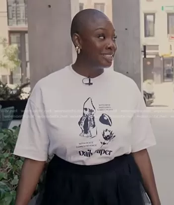on Good Morning America on ABC was spotted wearing this white graphic print tee on Good Morning America on Oct 19 2023's episode. 's Top is the Ruhinda T-Shirt by Daily Paper.