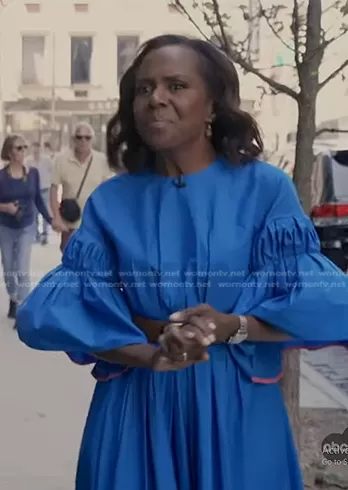 Deborah Roberts on Good Morning America on ABC was spotted wearing this blue poplin midi dress on Good Morning America on Oct 19 2023's episode. Deborah's Dress is the Iosefena Gathered-sleeve Cotton Midi Dress in Blue by Roksanda.