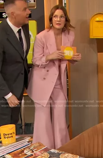 Drew Barrymore on The Drew Barrymore Show on CBS was spotted wearing this pink blazer and pants on The Drew Barrymore Show on Jun 18 2024's episode. Drew's Blazer is the Angela Wool Blazer Jacket by Gabriela Hearst . Drew's Pants is the Rhein Flared Wool Trousers by Gabriela Hearst . Drew's Necklace is the 18k Mini Inlay Heart Necklace by Jennifer Meyer . Drew's Shoes is the Jodie Platform Sandals by Saint Laurent.