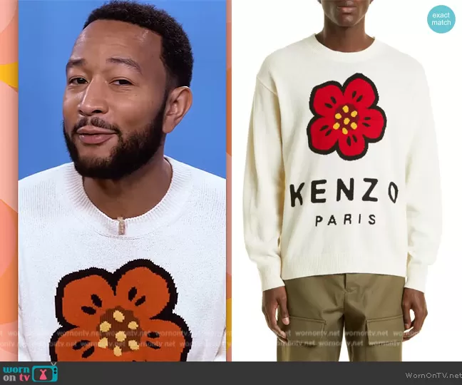 on The Drew Barrymore Show on CBS was spotted wearing this white flower graphic sweater on The Drew Barrymore Show on Oct 19 2023's episode. 's Sweater is the Intarsia Boke Flower Paris Logo Wool Sweater by Kenzo.