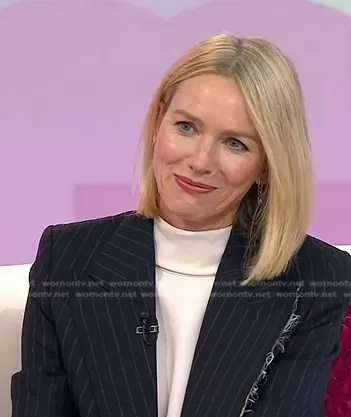 on Today on NBC was spotted wearing this pinstripe frayed blazer on Today on Oct 19 2023's episode. 's Jacket is the Bylee Pinstripe Wool Blend Jacket by Dries Van Noten.