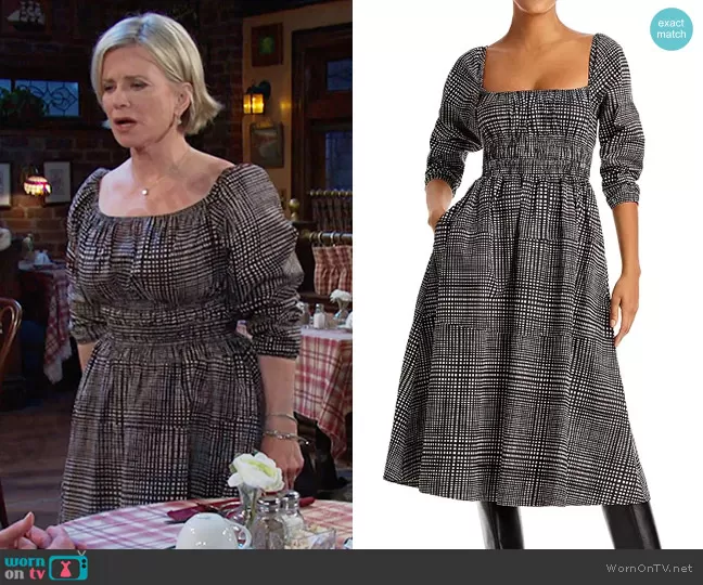 Kayla Brady (played by Mary Beth Evans) on Days of our Lives on Peacock was spotted wearing this black plaid cotton dress on Days of our Lives on Oct 20 2023's episode. Kayla's Dress is the Checked Cotton Poplin Midi Dress by Proenza Schouler White Label.