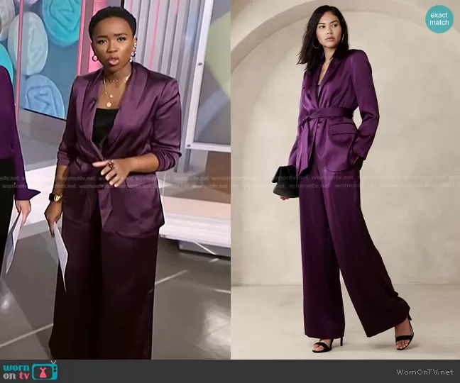 Zinhle Essamuah on NBC News Daily on NBC was spotted wearing this Zinhle’s purple satin blazer and wide leg pants on NBC News Daily on Oct 20 2023's episode. Zinhle's Jacket is the Satin Tie Waist Blazer in New Pinot Noir by Banana Republic . Zinhle's Pants is the Satin Wide-Leg Pant in New Pinot Noir by Banana Republic.
