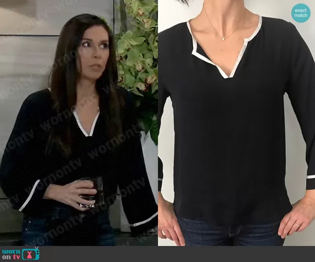 Anna Devane (played by Finola Hughes) on General Hospital on ABC was spotted wearing this navy top with white trim on General Hospital on Oct 20 2023's episode. Anna's Top is the Contrast Trim Tunic Top by Banana Republic .