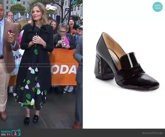 Savannah Guthrie on Today on NBC was spotted wearing this black geometric print skirt on Today on Oct 20 2023's episode. Savannah's Skirt is the Kaleidoscope Midi-Skirt in Black Multi by Akris Punto . Savannah's Shoes is the Block Heel Loafer Pump by Prada.
