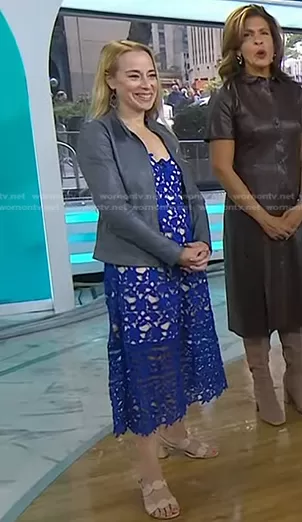 on Today on NBC was spotted wearing this blue lace dress on Today on Oct 20 2023's episode. 's Dress is the Azalea Dress in Cobalt by Self Portrait.