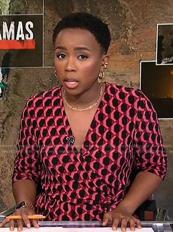 Zinhle Essamuah on NBC News Daily on NBC was spotted wearing this pink geometric print wrap dress on NBC News Daily on Oct 21 2023's episode. Zinhle's Dress is the Ity Classic Wrap Dress in Chianti Combo by Anne Klein.