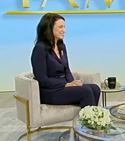 on Tamron Hall Show on ABC was spotted wearing this navy belted blazer on Tamron Hall Show on Oct 21 2023's episode. 's Suit is the Belted Pantsuit by Tahari ASL.
