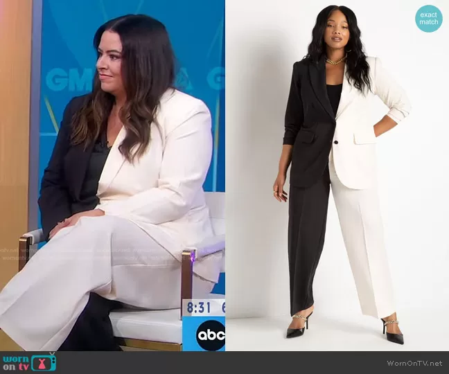 on Good Morning America on ABC was spotted wearing this black and white two-tone pant suit on Good Morning America on Oct 20 2023's episode. 's Jacket is the Colorblock Blazer in Black Onyx + White S by Eloquii . 's Pants is the Colorblock Pant in Black Onyx + White S by Eloquii.