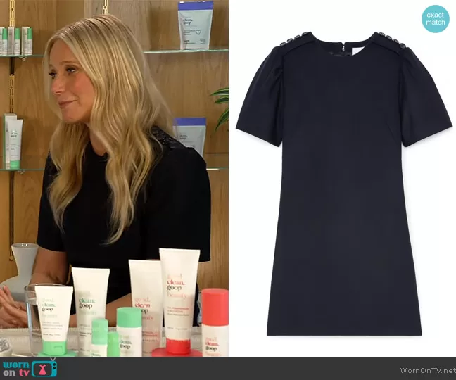 on The Drew Barrymore Show on CBS was spotted wearing this button shoulder dress on The Drew Barrymore Show on Oct 23 2023's episode. 's Dress is the Otto Puff-Sleeve Minidress by G. Label By Goop.