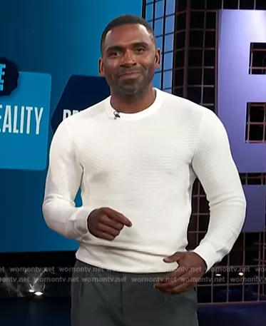 Justin Sylvester on E! News on E! was spotted wearing this white knit crewneck sweater on E! News on Oct 23 2023's episode. Justin's Sweater is the Crewneck Sweater in Washable Merino by Theory.
