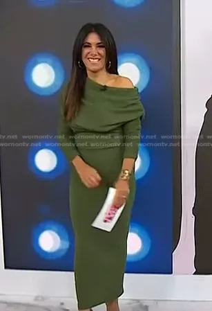 on Today on NBC was spotted wearing this green off-shoulder dress on Today on Oct 23 2023's episode. 's Dress is the Yasmine Off Shoulder Sweater Maxi Dress in Green by Fashion Nova.