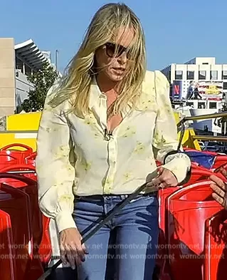 on Access Hollywood on NBC was spotted wearing this pink floral print blouse on Access Hollywood on Oct 24 2023's episode. 's Top is the Pastel Dreams puff-sleeve shirt by Dorothee Schumacher.