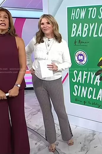 Jenna Bush Hager on Today on NBC was spotted wearing this white fringed sweater and grey check pants on Today on Oct 24 2023's episode. Jenna's Sweater is the Fringe Detail Sweater by Pearl by Lela Rose . Jenna's Pants is the Luxe Houndstooth Jacquard Pants in Oatmeal Combo by Naadam.
