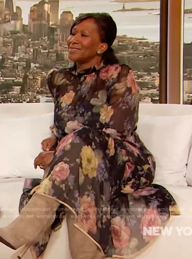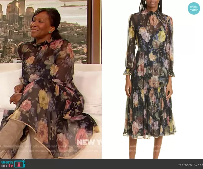 on The Drew Barrymore Show on CBS was spotted wearing this floral print dress on The Drew Barrymore Show on Oct 24 2023's episode. 's Dress is the Floral Long Sleeve Silk Chiffon Dress by Zimmermann.