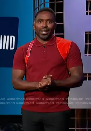 Justin Sylvester on E! News on E! was spotted wearing this red strap detail polo on E! News on May 17 2024's episode. Justin's Shirt is the Grosgrain Strap Polo Shirt by Alexander McQueen.