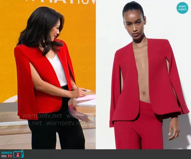 Nancy Chen on CBS Mornings on CBS was spotted wearing this red cape jacket on CBS Mornings on Oct 25 2023's episode. Nancy's Jacket is the Cape Blazer by Zara .