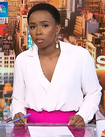 Zinhle Essamuah on NBC News Daily on NBC was spotted wearing this Zinhle white wrap blouse on NBC News Daily on Oct 25 2023's episode. Zinhle's Top is the Mimi Long Sleeve Half Tuck Blouse by Likely.