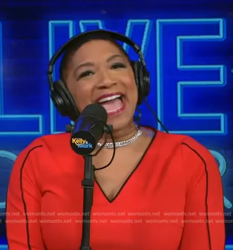 Deja Vu on Live with Kelly and Mark on Disney ABC Home Entertainment was spotted wearing this red piping dress on Live with Kelly and Mark on Dec 08 2023's episode. Deja Vu's Dress is the Scuba Crepe Piping Trim Sheath Dress by Calvin Klein.