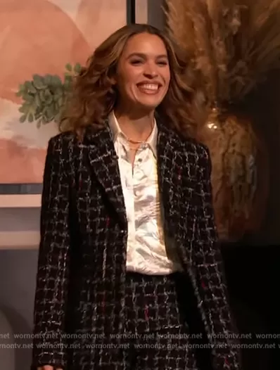 on The Drew Barrymore Show on CBS was spotted wearing this black tweed blazer on Drew Barrymore Show on Oct 25 2023's episode. 's Jacket is the 2022 Fall Winter Collection by Chanel . 's Shorts is the 2022 Fall Winter Collection by Chanel.