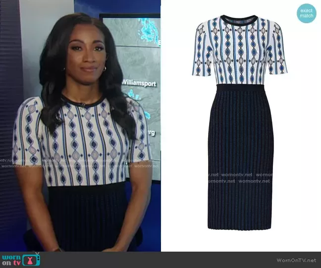 Brittany Bell on Good Morning America on ABC was spotted wearing this white and blue printed knit dress on Good Morning America on Apr 18 2024's episode. Brittany's Dress is the Melilla Dress by Shoshanna.