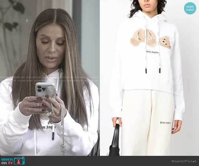 Dorit Kemsley on The Real Housewives of Beverly Hills on Bravo was spotted wearing this white print hoodie on The Real Housewives of Beverly Hills on episode 'The Eaglewoman Has Landed' (13x01) in Oct 2023. Dorit's Sweater is the Bear Hoodie by Palm Angels.