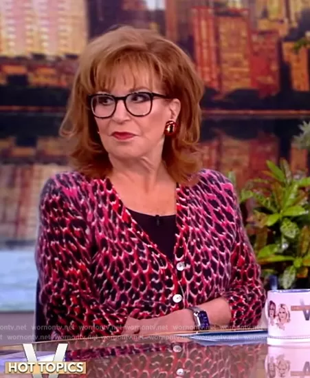 Joy Behar on The View on ABC was spotted wearing this pink leopard print cardigan on The View on Oct 26 2023's episode. Joy's Sweater is the Mirka Cashmere Leopard Print Cardigan by Zadig and Voltaire.