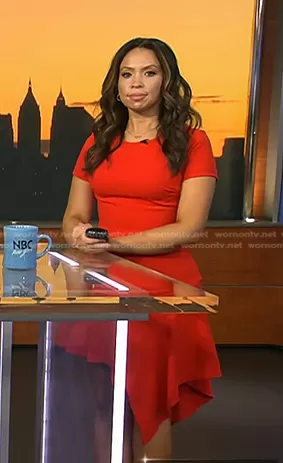 Adelle Caballero on Today on NBC was spotted wearing this red asymmetric hem dress on Today on Oct 26 2023's episode. Adelle's Dress is the Drape Hem Dress by Slate & Willow.