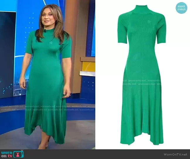 Ginger Zee on Good Morning America on ABC was spotted wearing this green asymmetric hem dress on Good Morning America on Oct 26 2023's episode. Ginger's Dress is the Slim Fit Mockneck Dress by Tommy Hilfiger.