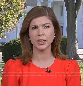on NBC News Daily on NBC was spotted wearing this red long sleeve dress on NBC News Daily on Oct 26 2023's episode. 's Dress is the Knit Crepe Dress by Tory Burch.