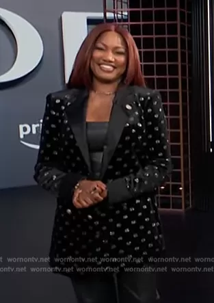 on E! News on E! was spotted wearing this black embellished blazer on E! News on Oct 30 2023's episode. 's Blazer is the 2021 Fall Winter Collection by Bronx and Banco.