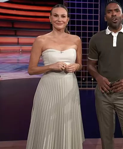 Keltie Knight on E! News on E! was spotted wearing this silver pleated skirt on E! News on Oct 30 2023's episode. Keltie's Skirt is the Elle Metallic Pleated Midi Skirt by Reiss.