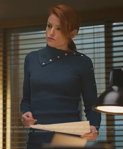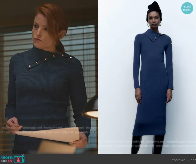 (played by ) on Elite on Netflix was spotted wearing this Blue ribbed button detail dress on Elite on episode 'Bling-Bling' (7x03) in Oct 2023. 's Dress is the Knit Dress with Side Buttons by Zara.