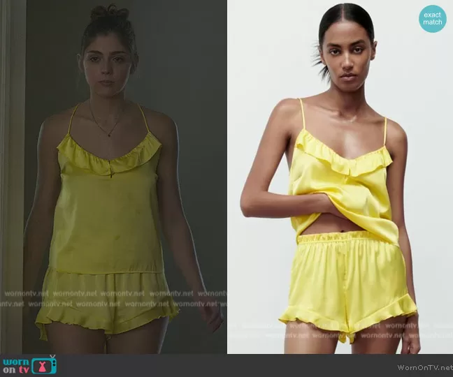 Sara (played by Carmen Arrufat Blasco) on Elite on Netflix was spotted wearing this yellow ruffle top and shorts on Elite on episode 'Por favor, di la verdad' (7x05) in Oct 2023. Sara's Set is the Ruffle Top and Short Set by Zara.