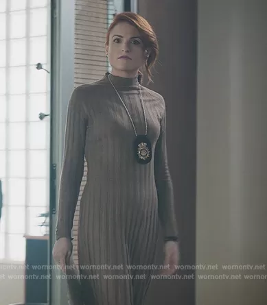 Luena (played by María Ordóñez) on Elite on Netflix was spotted wearing this brown ribbed long sleeve dress on Elite on episode 'Tocar fondo' (7x06) in Oct 2023. 's Dress is the Knitted Perkins Neck Dress by Mango.