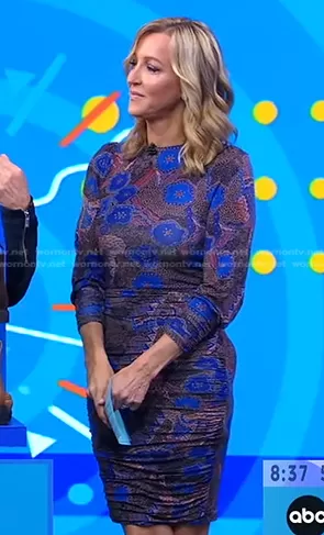 Lara Spencer on Good Morning America on ABC was spotted wearing this brown and blue floral dress on Good Morning America on Oct 30 2023's episode. Lara's Dress is the Jessi Printed Bodycon Dress in Bleu by Ba&Sh.