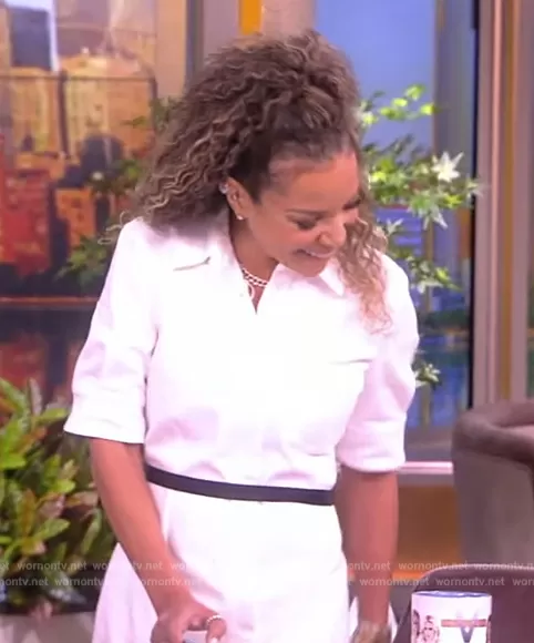 Sunny Hostin on The View on ABC was spotted wearing this white belted shirtdress on The View on Oct 30 2023's episode. Sunny's Dress is the Kieran Belted Stretch Denim Shirtdress by Altuzarra.
