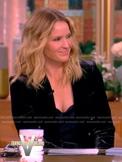 Sara Haines on The View on ABC was spotted wearing this navy velvet blazer on The View on Oct 30 2023's episode. Sara's Blazer is the Gaya Velvet Dickey Jacket by Veronica Beard.