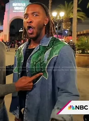 on Today on NBC was spotted wearing this snakeskin panel denim jacket on Today on Oct 30 2023's episode. 's Shirt is the Snake-Print Denim Shirt by Bally.