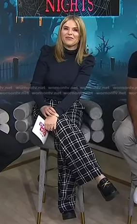 Jenna Bush Hager on Today on NBC was spotted wearing this navy turtleneck top and black plaid pants on Today on Oct 30 2023's episode. Jenna's Top is the Cedar Puff-Sleeve Turtleneck Top by Veronica Beard . Jenna's Pants is the Oversized Plaid Hanna Pant in Black by Pearl by Lela Rose . Jenna's Shoes is the Wynter Lug Sole Mule by Veronica Beard.