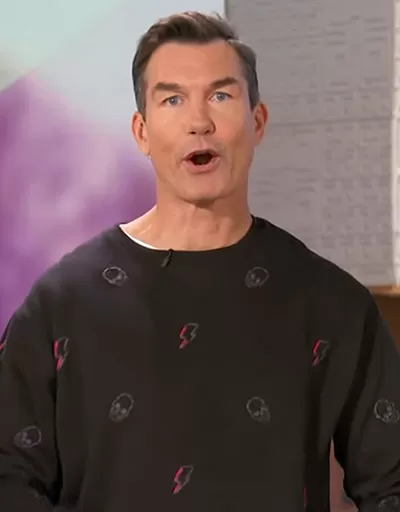 Jerry O'Connell on The Talk on CBS was spotted wearing this black skull print sweatshirt on The Talk on Oct 31 2023's episode. Jerry's Sweater is the Skeletor Sweatshirt by One432.