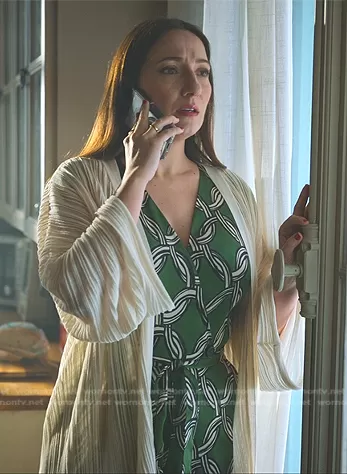 Maria (played by Olaya Caldera) on Elite on Netflix was spotted wearing this green print jumpsuit on Elite on episode 'I'm Gonna End This Forever' (7x08) in Oct 2023. 's Jumpsuit is the Chain Print Tie Belt Jumpsuit in Green by Mango.